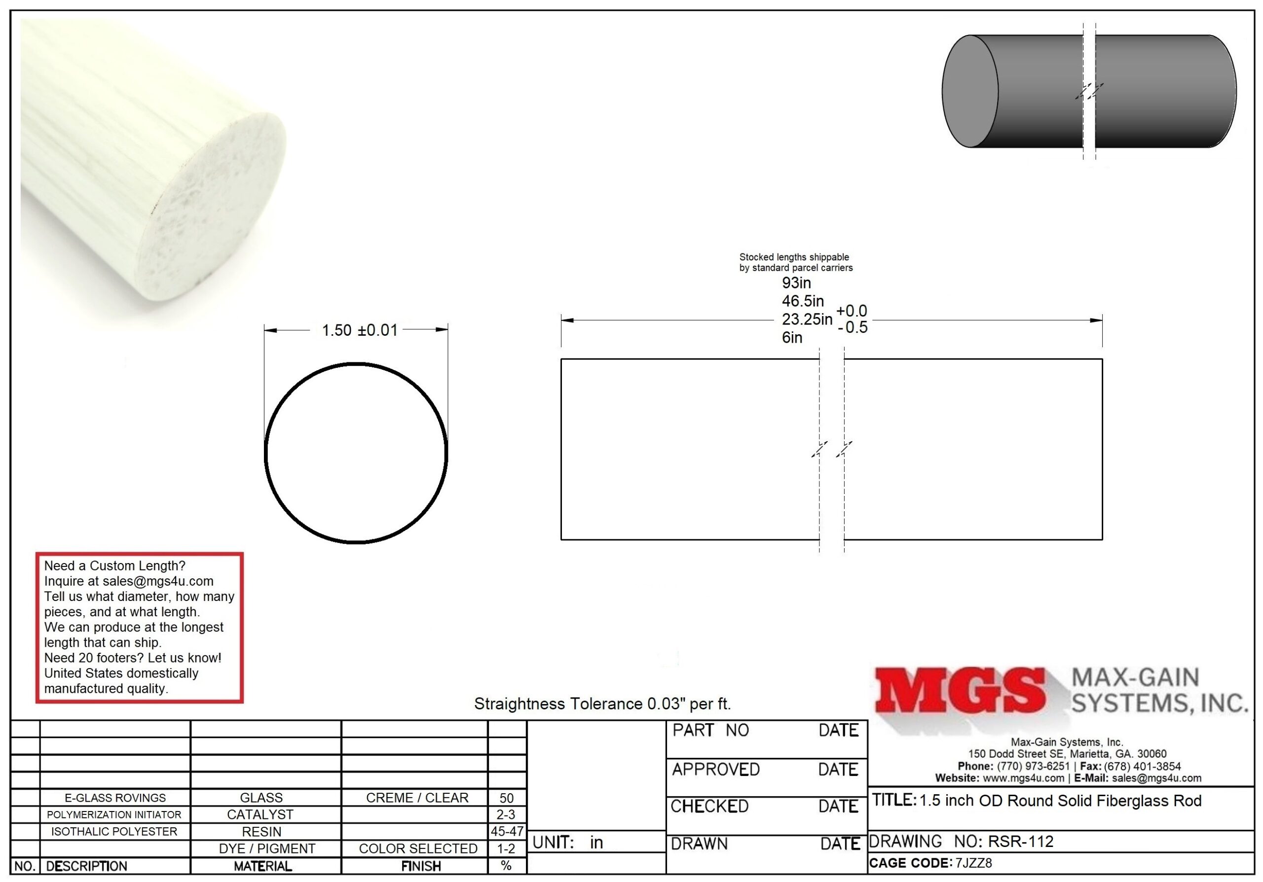Our 1-1/2″ OD fiberglass rod is made by the pultrusion process. Fiberglass unidirectional roving (for maximum strength), pulled via hydraulics through a bath of resin and pigment. Heated and cured. Our stock lengths are the perfect sizes to ship via standard parcel carriers like FedEx and Post. 8 foot long lengths fit under the oversize 3 shipping mark. Oversize 3 goods (anything over 96.02 inches) will all ship at freight rates which start at $120 and rise from there making our lengths of tube and rod perfect for prototyping, hobbyist, etc…