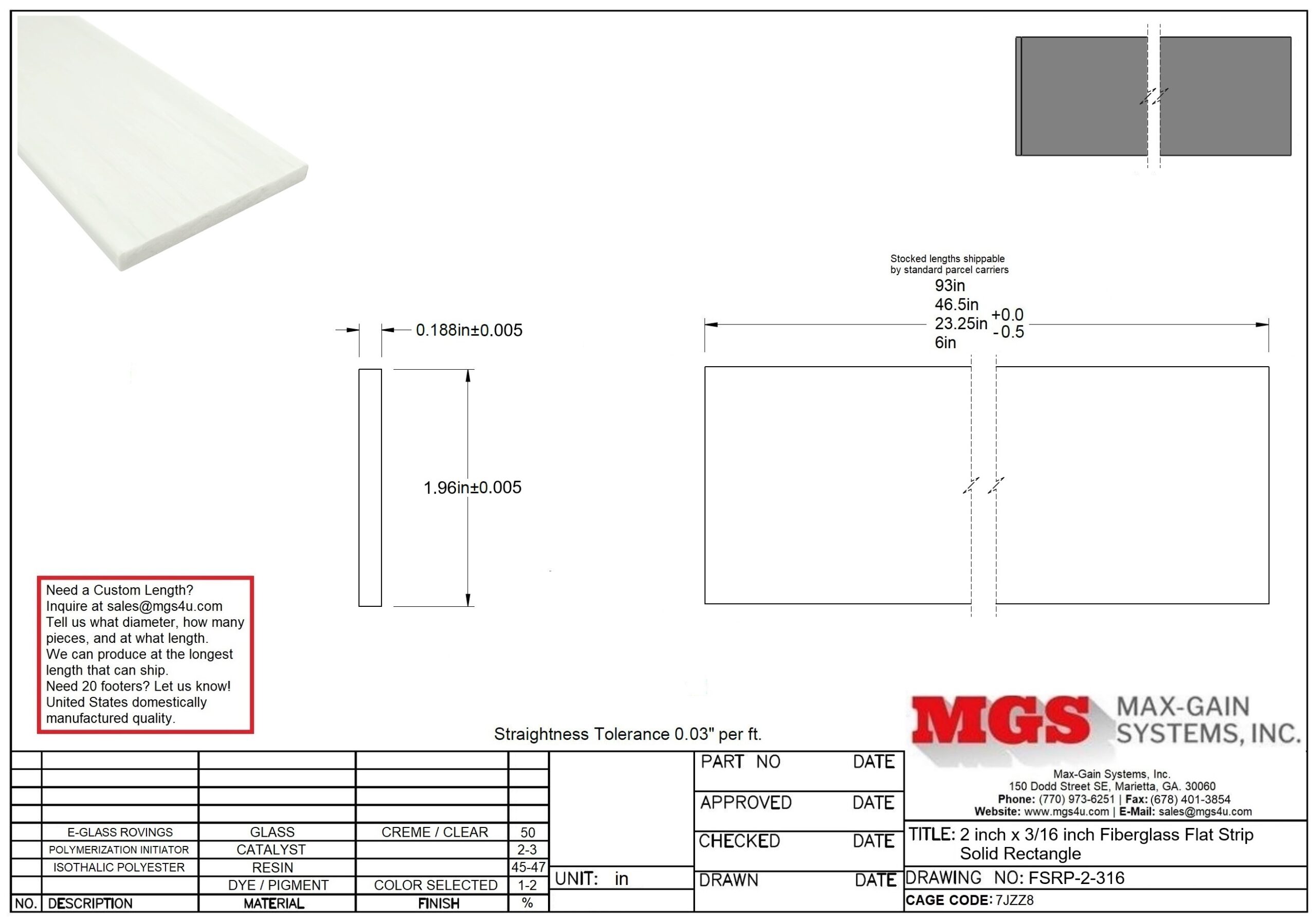 Our 2″ x 3/16″ Fiberglass flat strip solid rectangle is made by the pultrusion process. Fiberglass unidirectional roving (for maximum strength), pulled via hydraulics through a bath of resin and pigment. Heated and cured. Our stock lengths are the perfect sizes to ship via standard parcel carriers like FedEx and Post. Our 93 inch lengths fit under the oversize 3 shipping mark. Oversize 3 goods (anything over 96.02 inches) will all ship at freight rates which start at $120 and rise from there making OUR lengths of tube and rod perfect for prototyping, hobbyist, etc…