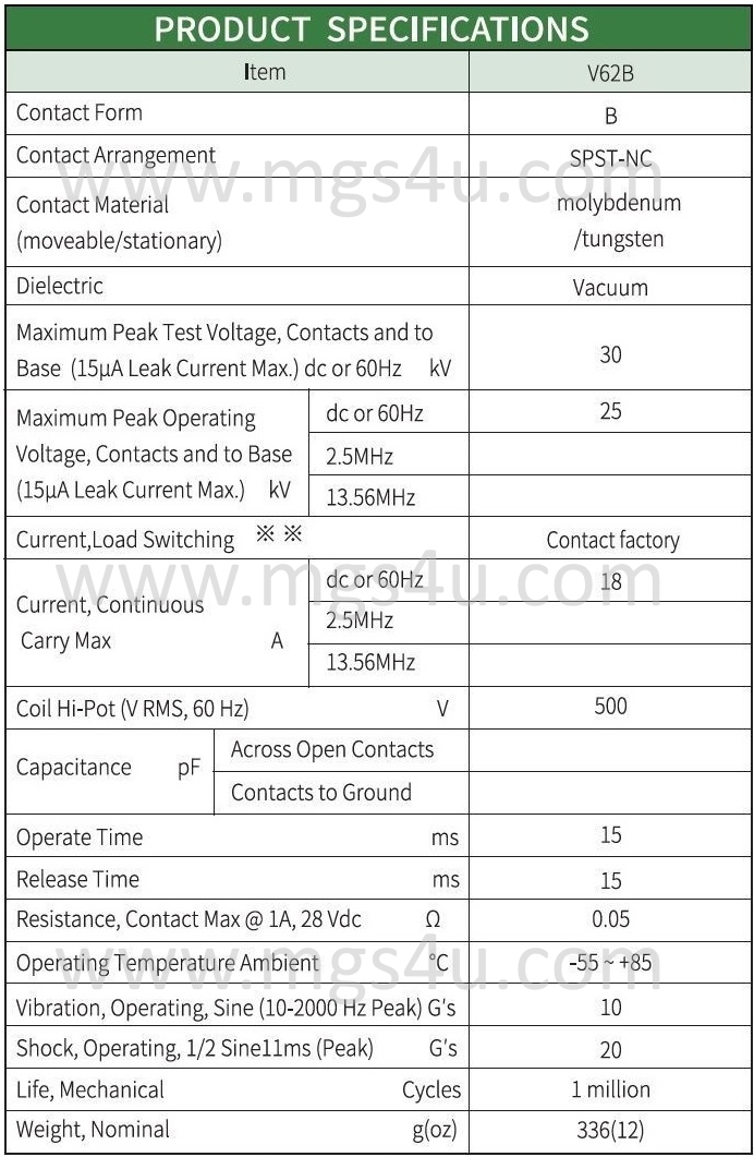 Greenstone V62B741 ceramic vacuum relay, SPST-NC