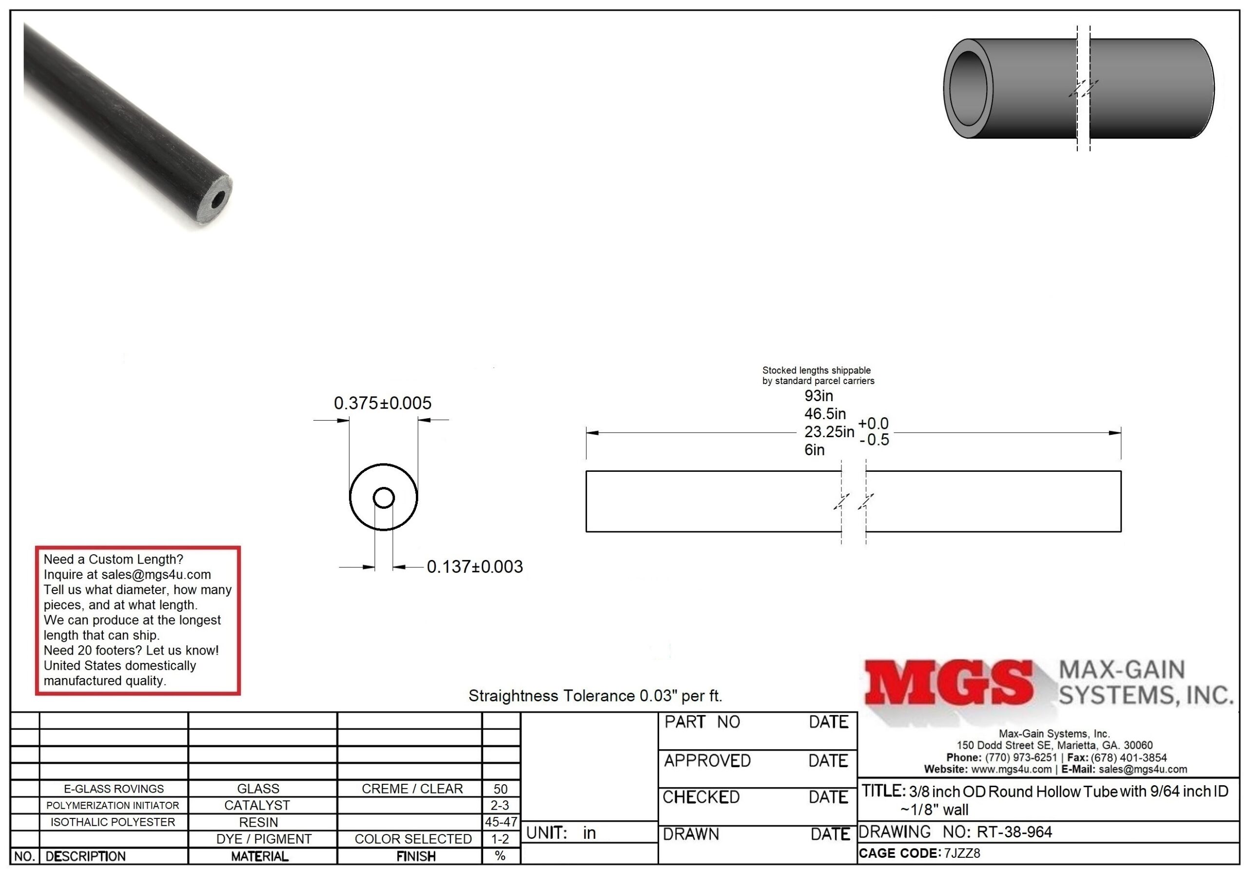 Our 3/8″ OD, 9/64″ ID, fiberglass tube is made by the pultrusion process. Fiberglass unidirectional roving (for maximum strength), pulled via hydraulics through a bath of resin and pigment. Heated and cured. Our stock lengths are the perfect sizes to ship via standard parcel carriers like FedEx and Post. 8 foot long lengths fit under the oversize 3 shipping mark. Oversize 3 goods (anything over 96.02 inches) will all ship at freight rates which start at $120 and rise from there making our lengths of tube perfect for prototyping, hobbyist, etc…