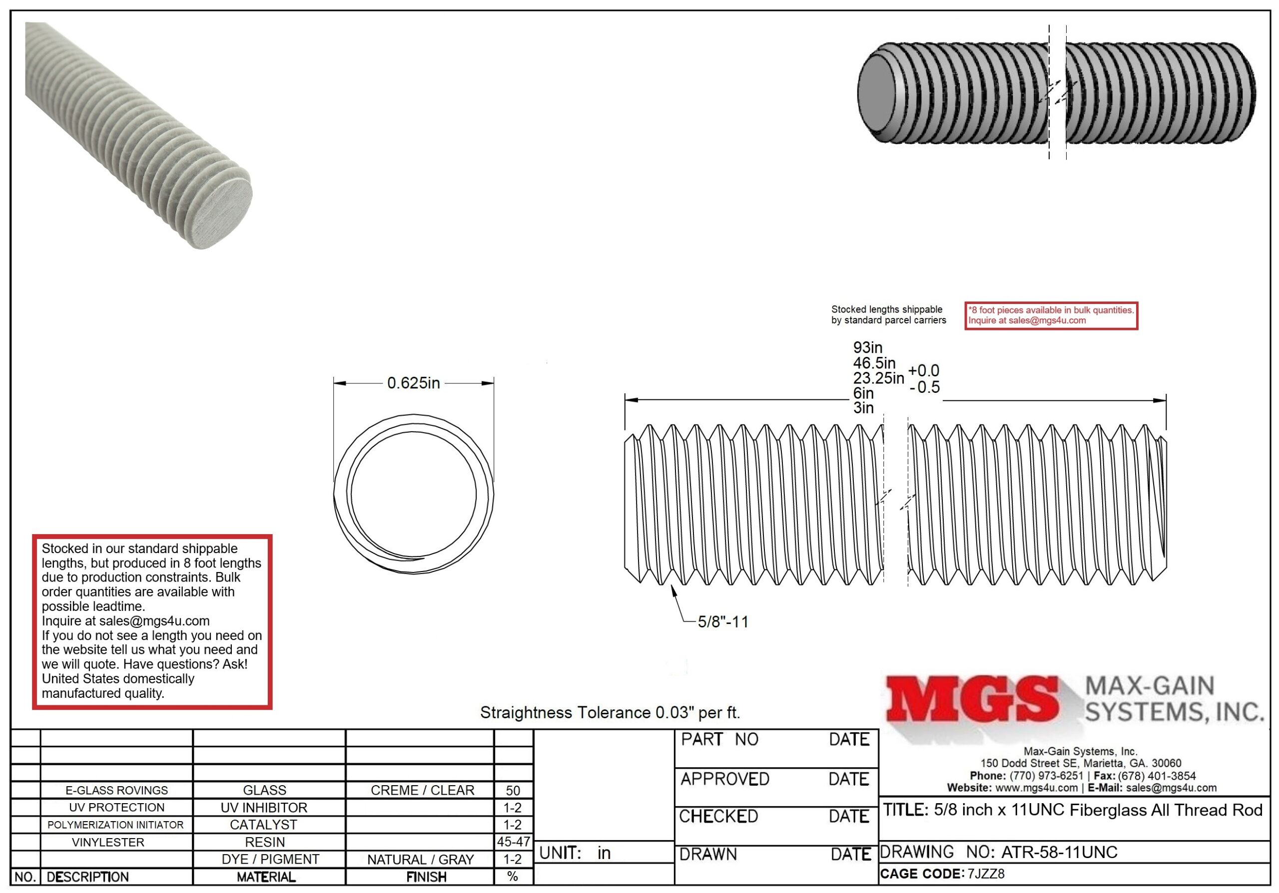 Our 5/8″ OD fiberglass all thread rod is made by the pultrusion process and centerless grinding. Fiberglass unidirectional roving (for maximum strength), pulled via hydraulics through a bath of resin and pigment. Heated and cured. Our stock lengths are the perfect sizes to ship via standard parcel carriers like FedEx and Post. 8 foot long lengths fit under the oversize 3 shipping mark. Oversize 3 goods (anything over 96.02 inches) will all ship at freight rates which start at $120 and rise from there making our lengths of tube and rod perfect for prototyping, hobbyist, etc…