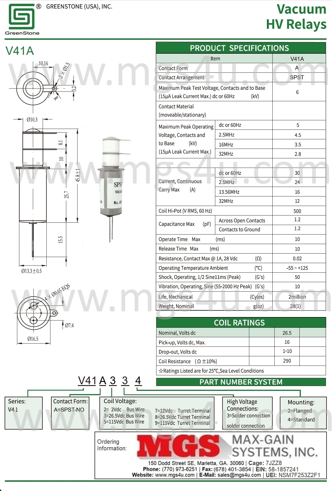 Greenstone V41A334 SPST-NO Vacuum Relay