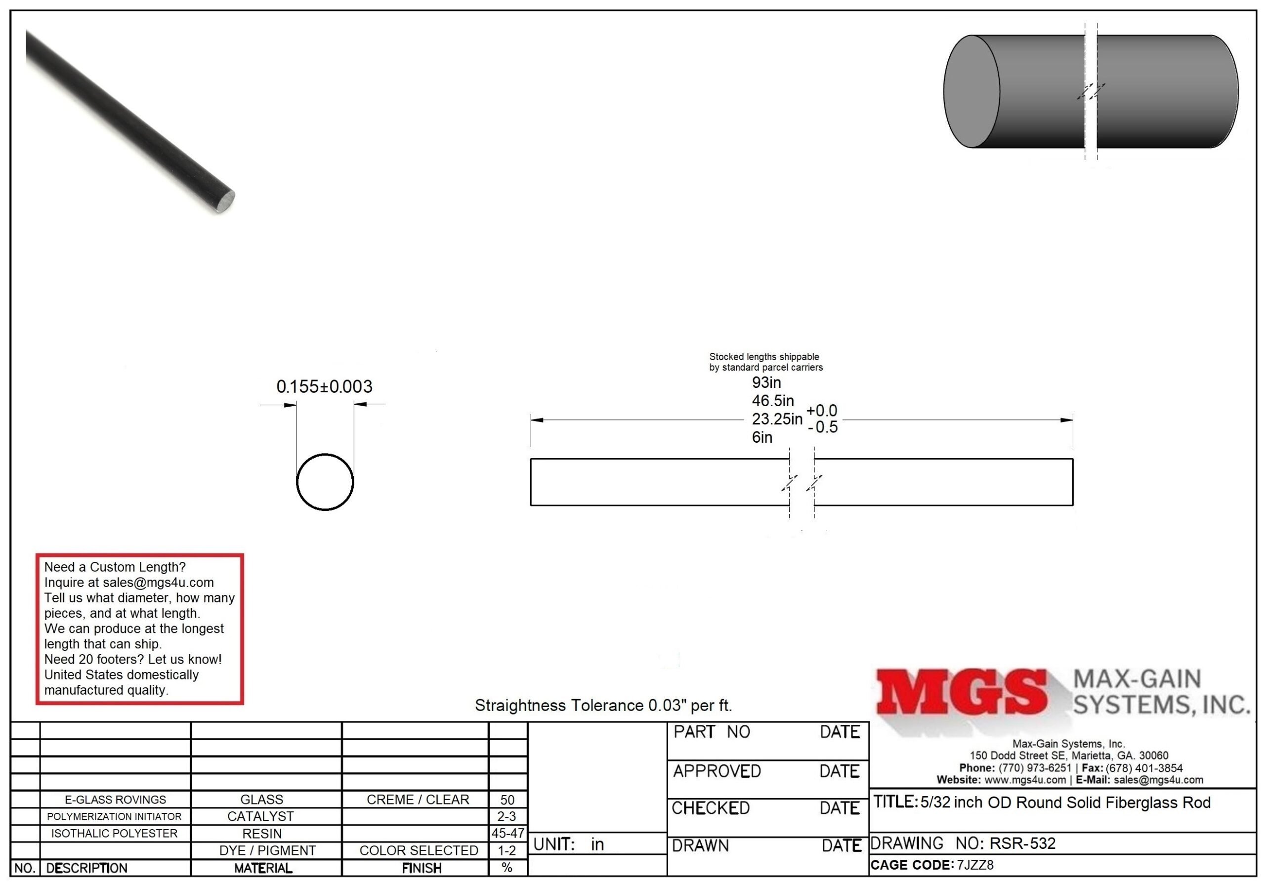 Our 5/32″ OD fiberglass rod is made by the pultrusion process. Fiberglass unidirectional roving (for maximum strength), pulled via hydraulics through a bath of resin and pigment. Heated and cured.Our stock lengths are the perfect sizes to ship via standard parcel carriers like FedEx and Post. 8 foot long lengths fit under the oversize 3 shipping mark. Oversize 3 goods (anything over 96.02 inches) will all ship at freight rates which start at $120 and rise from there making our lengths of tube and rod perfect for prototyping, hobbyist, etc…