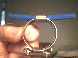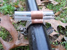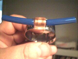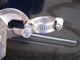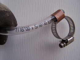 These clamps consist of an ALL STAINLESS hose screw-clamp.. (be certain the screw clamp says “All Stainless” or the screw itself will be plated, not stainless, and it will eventually rust), a short length of copper plumbing pipe, and a plastic tube. Very simple, but effective. For the plastic tube, it is best to use a very tough and UV resistant material such as truck air-brake hose (from auto parts store) instead of clear vinyl tube. It will last MUCH longer. Also, spray-paint the plastic tube with flat-black spray paint for additional UV protection.