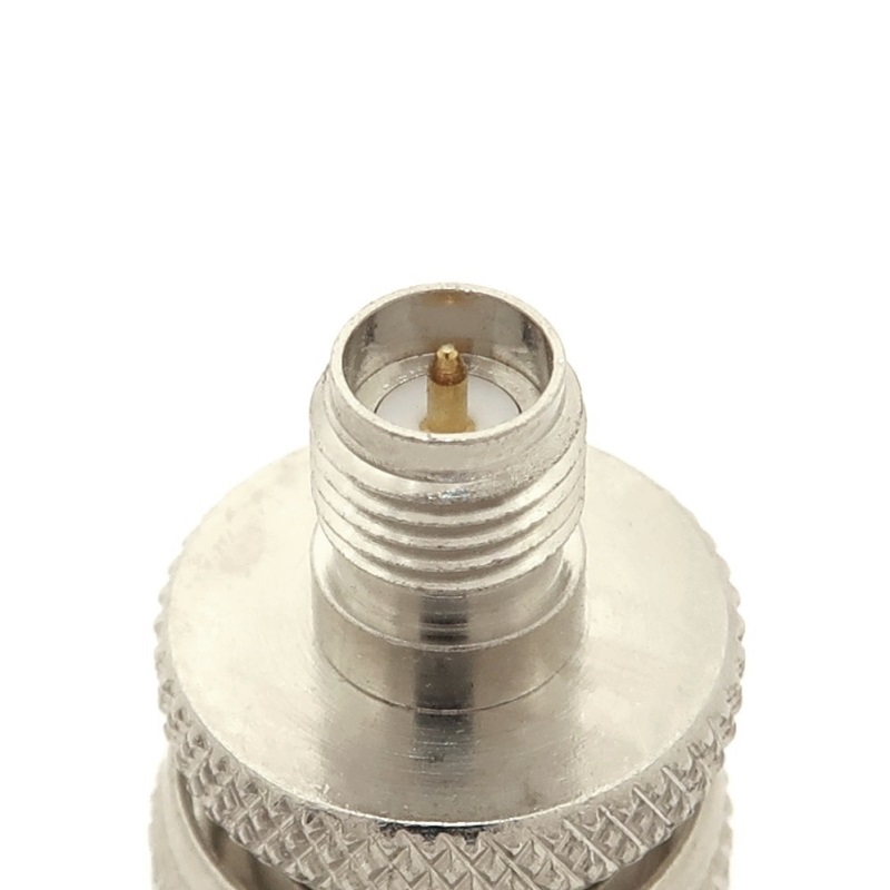 This adapter is made from a Solid Brass body that is precision machined and plated with Nickel for superior performance and value. This RP-SMA male to TNC female Adapter adapter has a PTFE dielectric and a gold plated brass center pin. The RP-SMA male side provides the same threads as an SMA male and pins that are normally found in SMA female connections; RP-SMA connections are popular in Wi-Fi, WiMAX, and other computer applications. The TNC female side provides a threaded connection very similar to a BNC connection, substituting the bayonets for threads.