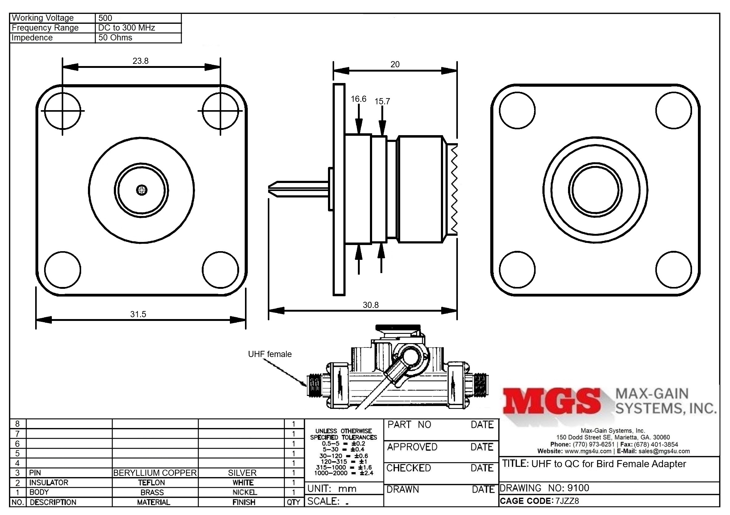 This UHF Female to QC for Bird adapter is one of several thousand RF products available from Max-Gain Systems, Inc. This adapter is a between series coaxial adapter.