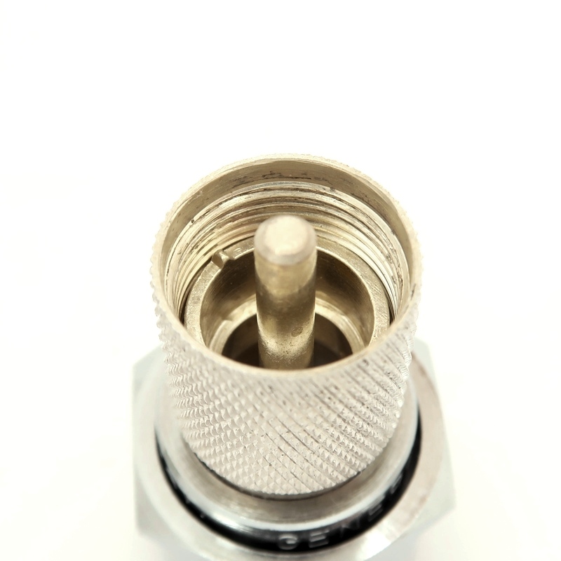 This 50 Ohm GR874 adapter is designed by the General Radio Company and precision manufactured for military and laboratory use. The UHF male side (also known as a PL-259 connection) is by far the most popular connection type used in Amateur Radio. The GR874 connection type is sexless in that all GR-874 connectors and adapters will mate with one another. Used in applications up to ~8 GHz.